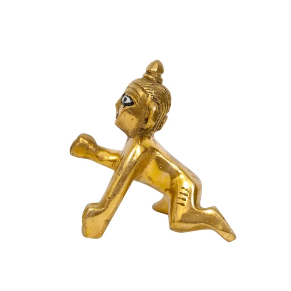 This idol is made from solid brass and finished with a high-quality polish that enhances its golden appearance. The surface is smooth, resistant to minor wear, and easy to maintain. Unlike coated or hollow idols, this solid brass Laddu Gopal Ji Idol offers weight, strength, and a premium feel.